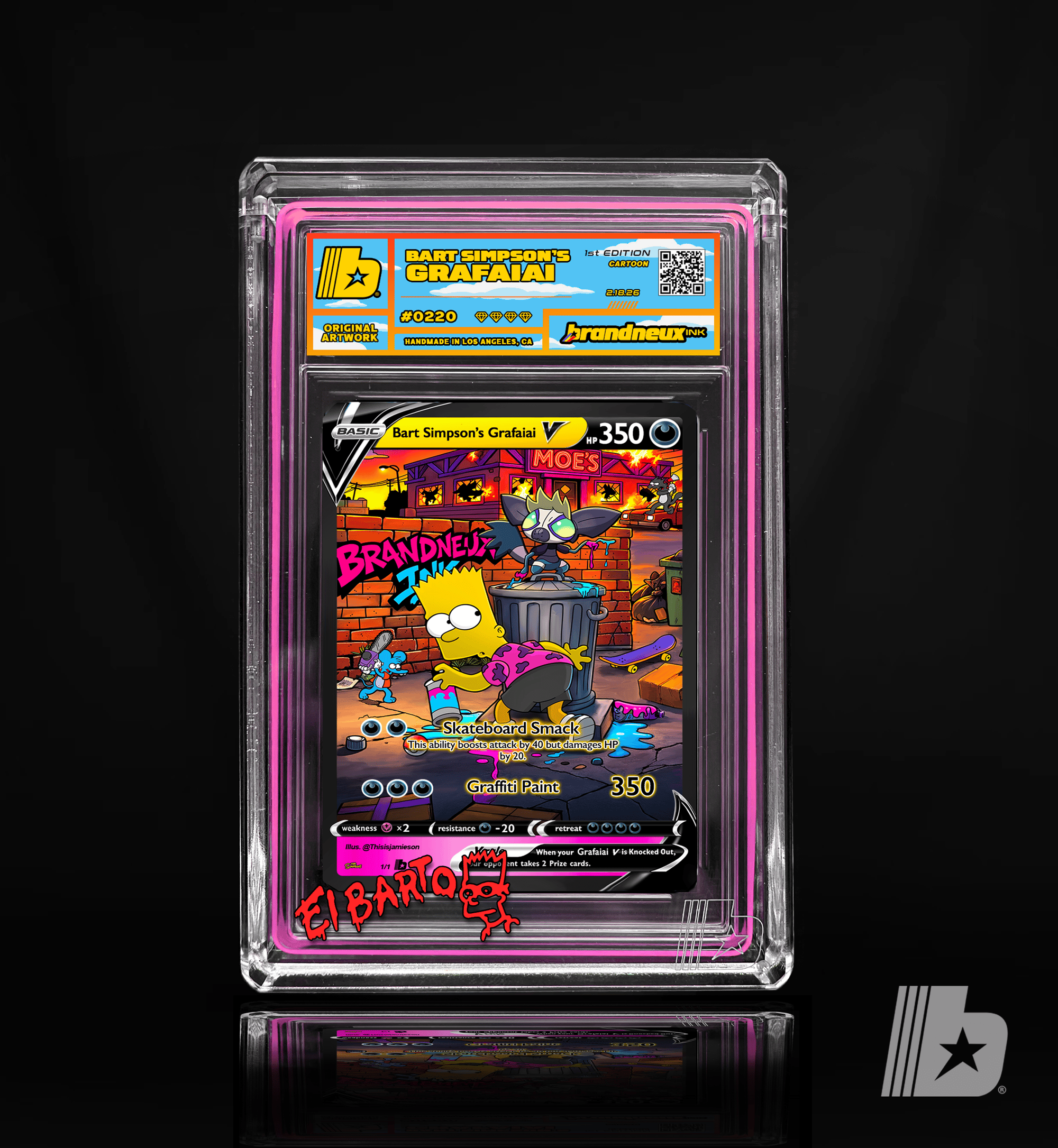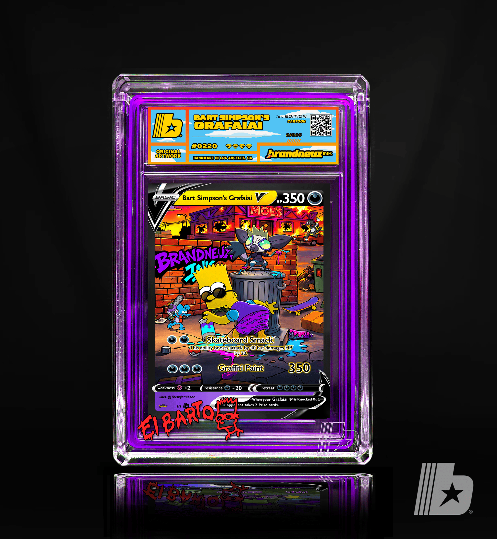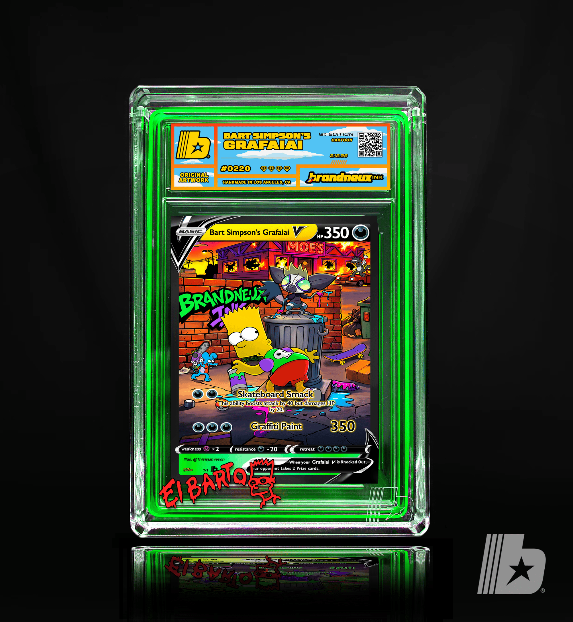 "When Bart Simpson links up with Grafaiai, mischief turns into a full scale neon takeover across Springfield. What starts as a few harmless tags behind the Kwik E Mart quickly spreads into a citywide explosion of color, attitude, and rebellion. Grafaiai’s toxic paint drips and crackles with chaotic energy while Bart stands back with that slingshot grin, turning alleyways into galleries and brick walls into bold statements. Every splash feels reckless, every line feels defiant, capturing the thrill of late nights, close calls, and art that refuses to ask permission. This piece is a tribute to rule breakers, boundary pushers, and anyone who sees a blank wall not as empty space but as opportunity."