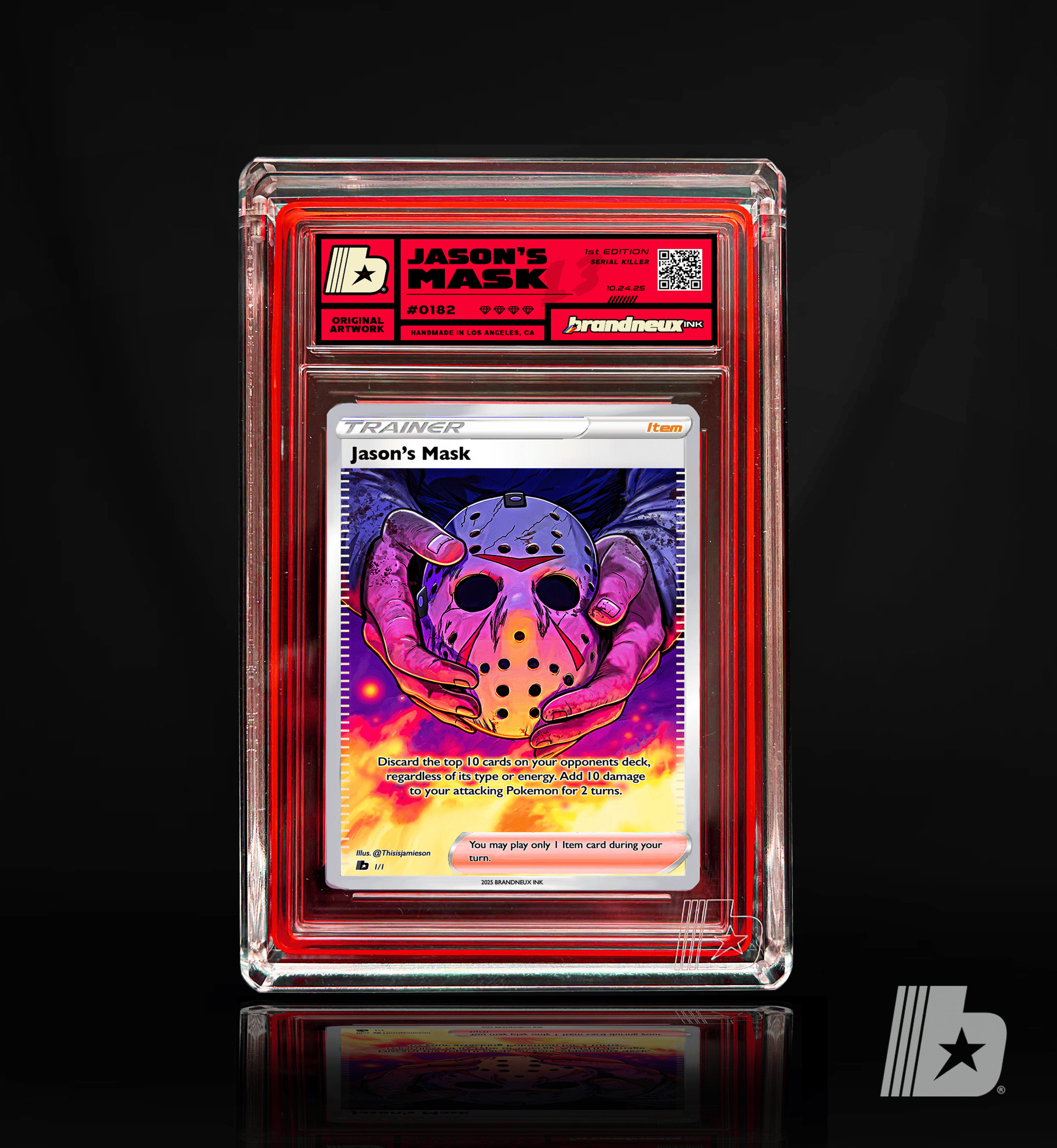 "The iconic hockey mask worn by Jason Voorhees — a chilling symbol of vengeance and unstoppable horror. Once meant for protection, it became a visage of fear, silence, and endless pursuit through the shadows of Camp Crystal Lake." Another addition to Brandneux's Legendary Horror Items."
