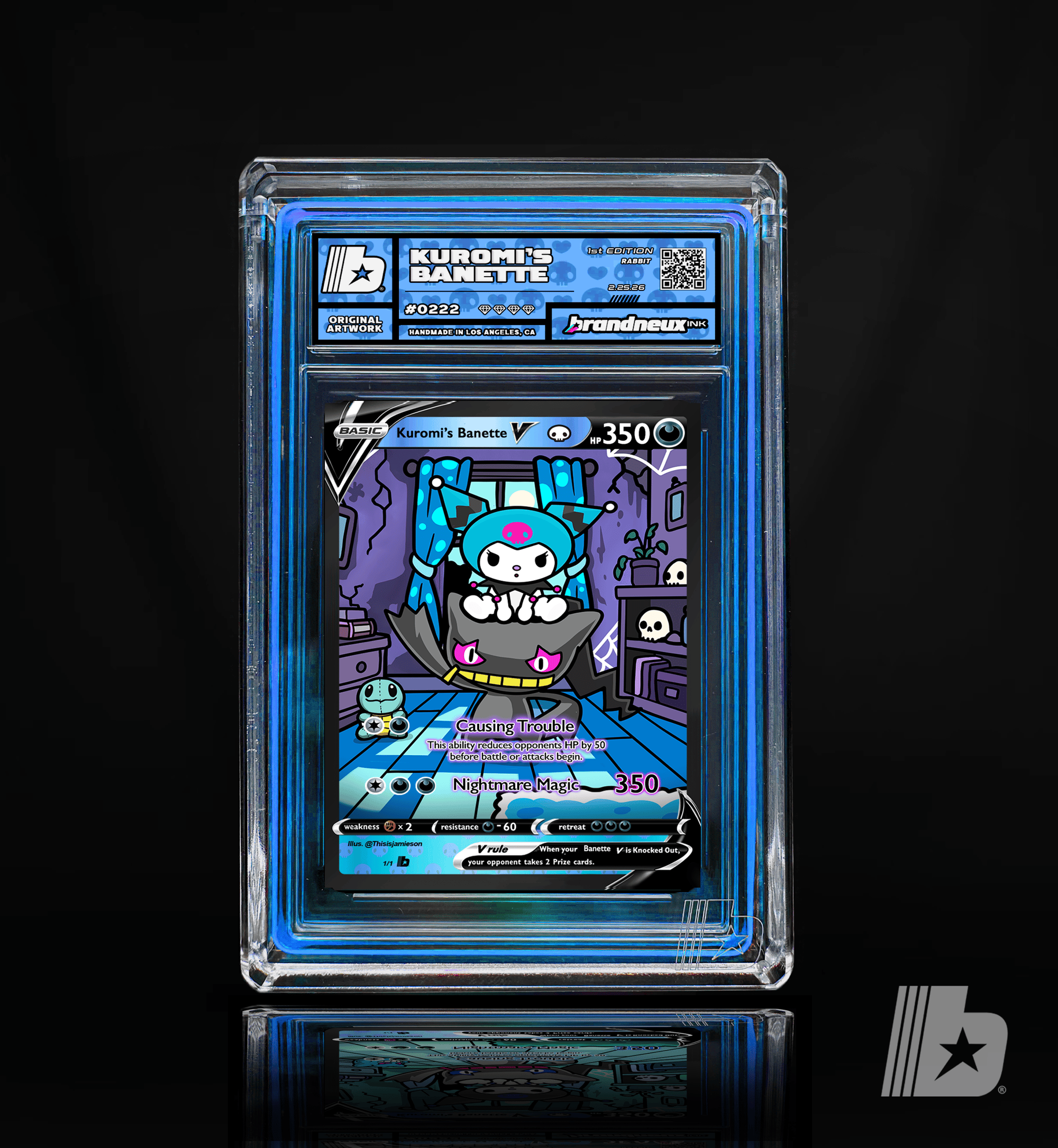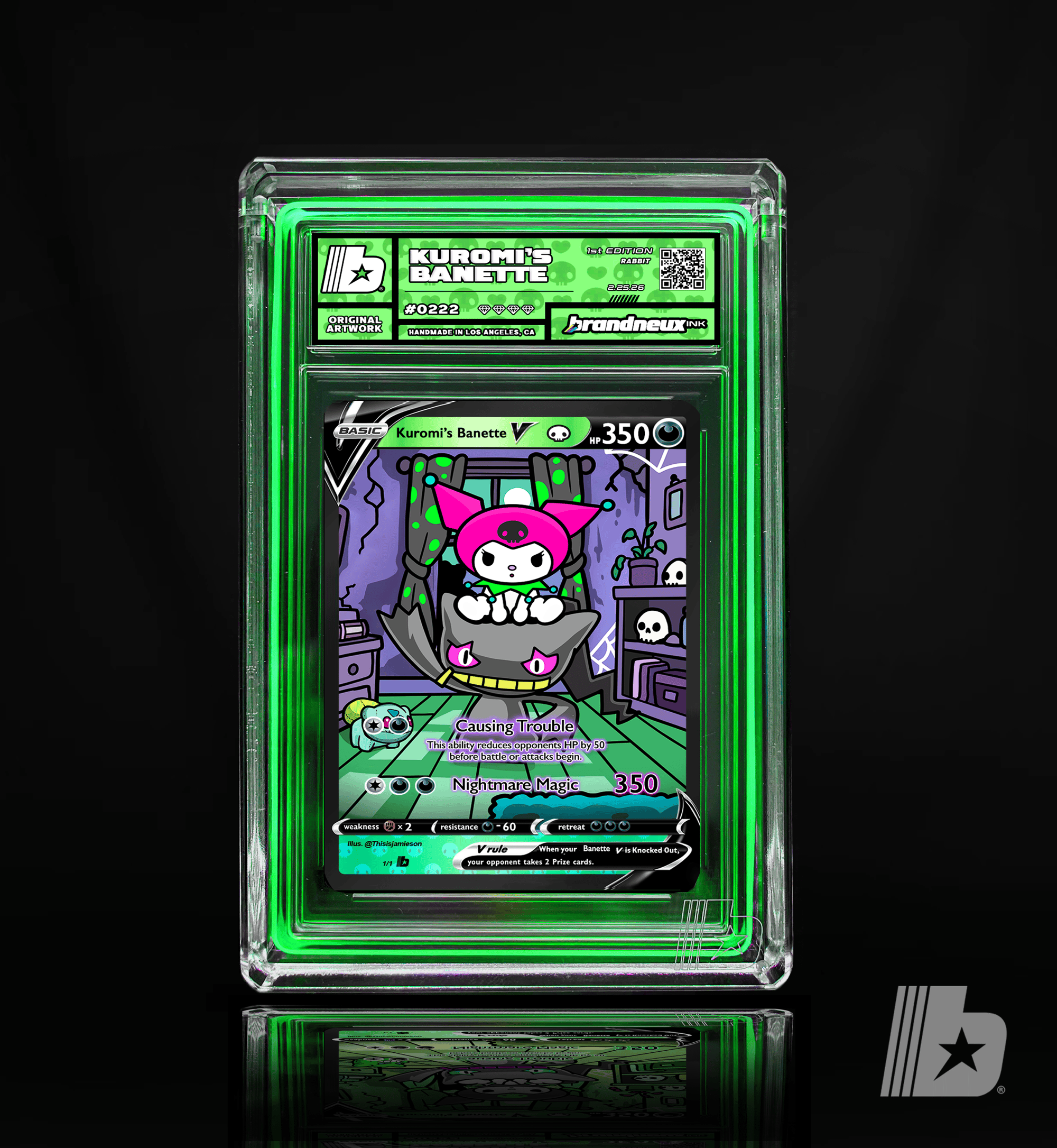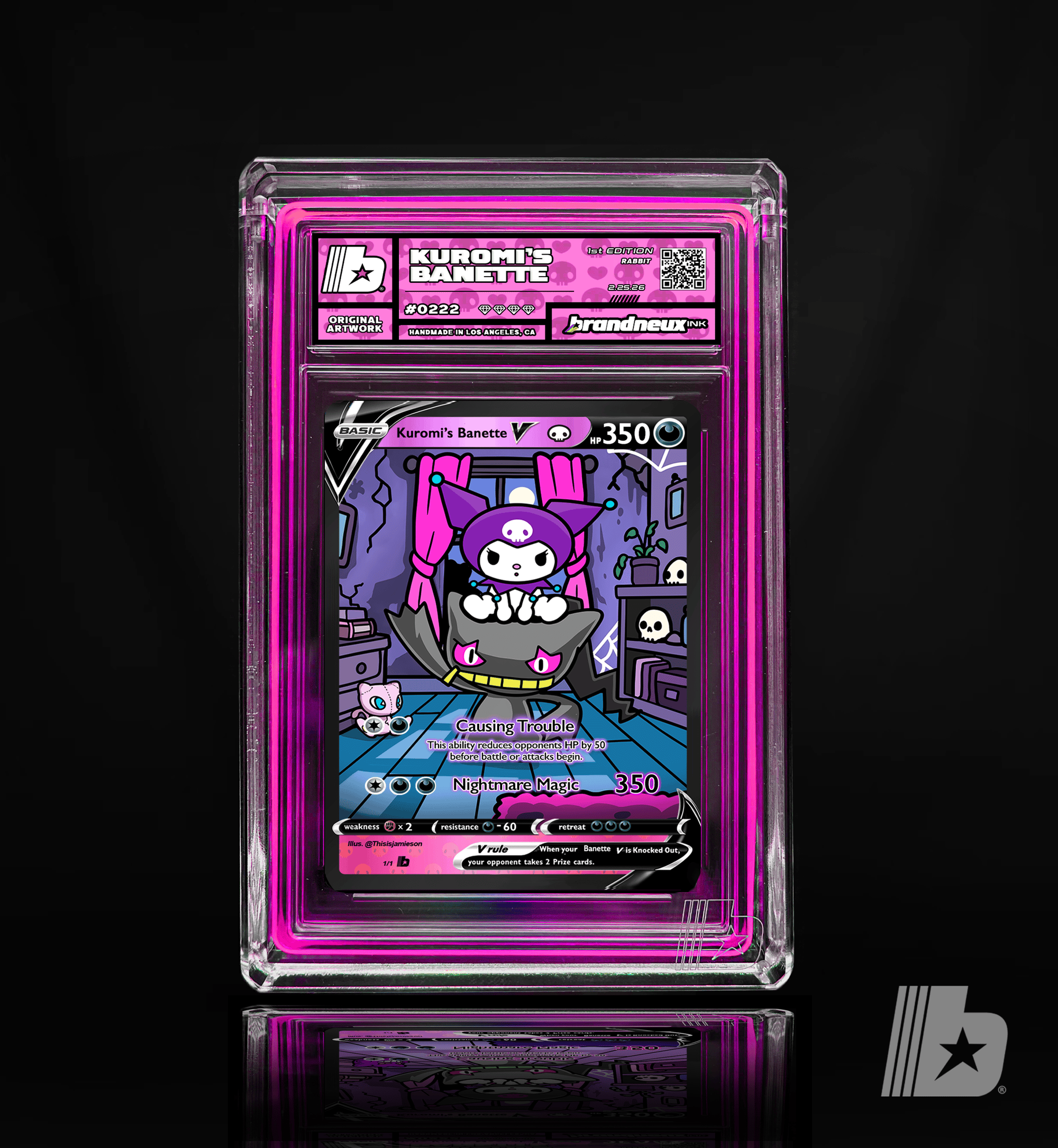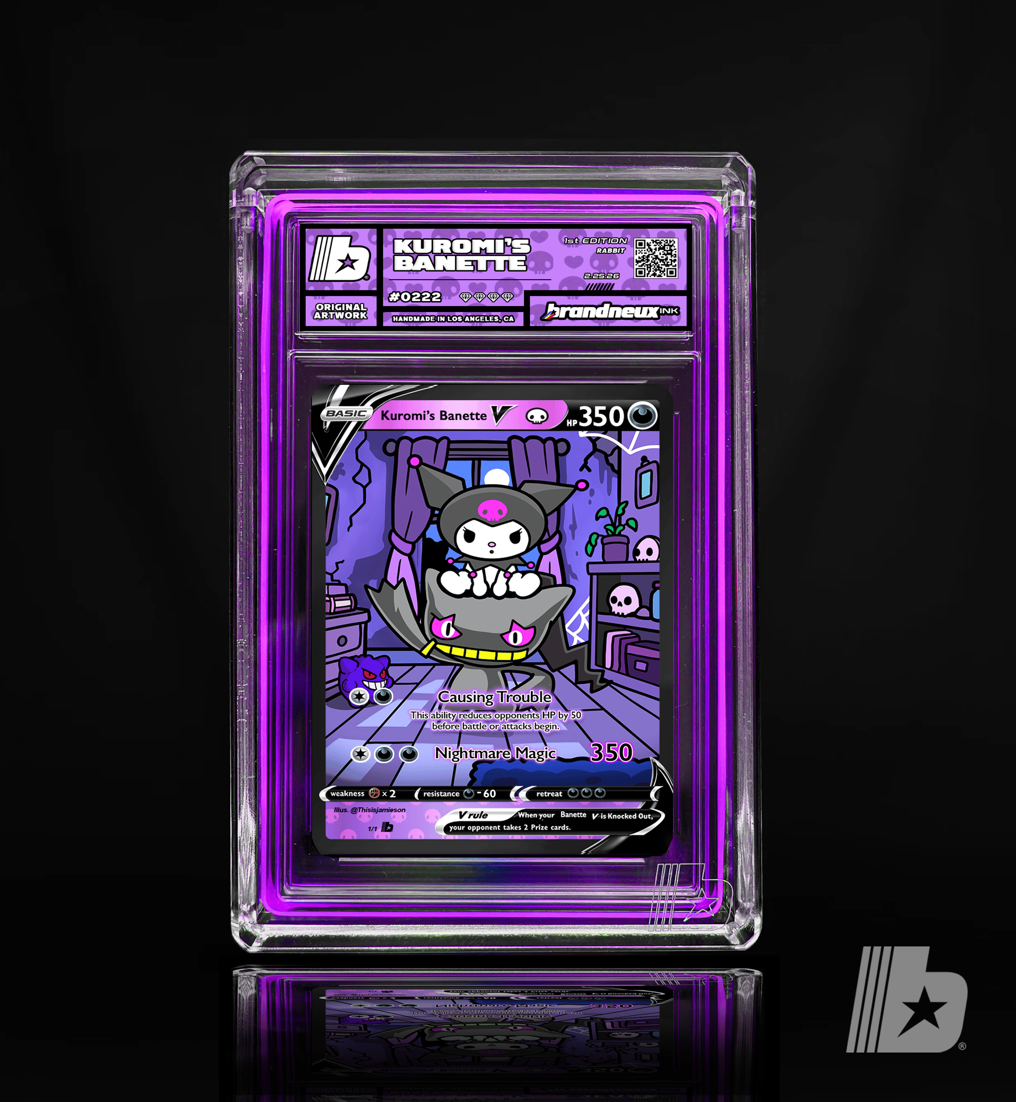 "Kuromi and Banette share a bond born from mischief and misunderstood hearts. Kuromi’s playful rebellion and fearless attitude perfectly match Banette’s eerie loyalty, a Pokémon said to come alive through forgotten emotions and lingering grudges. Together, they roam the night causing harmless chaos, turning shadows into laughter and darkness into personality. Where Kuromi brings bold attitude and punk charm, Banette channels mysterious ghostly energy, protecting its partner while embracing the strange and unconventional. Their partnership represents embracing flaws, owning individuality, and finding power in the parts of yourself the world once overlooked."