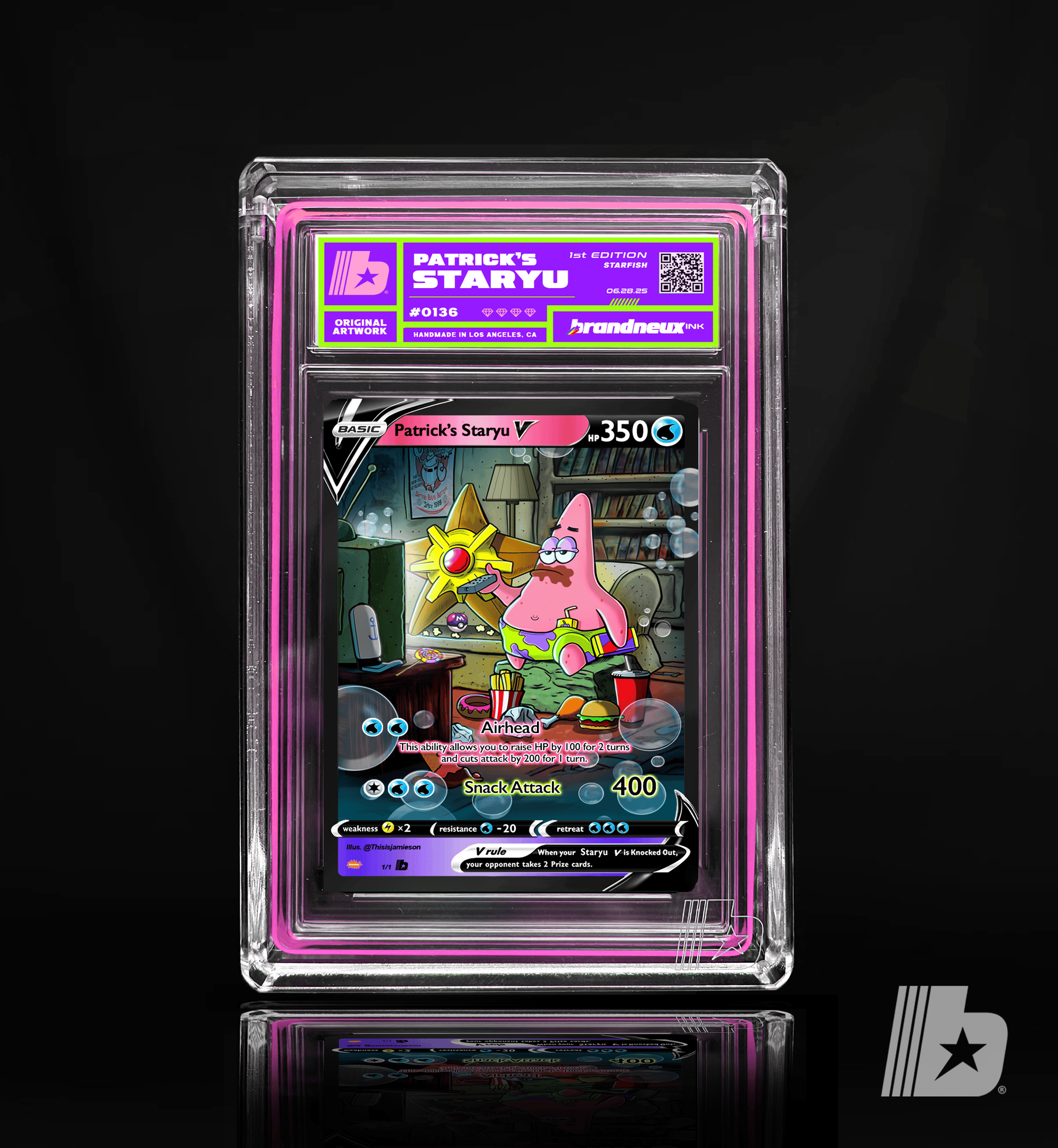 "Under the glow of the TV and a mountain of snacks, Patrick Star and Staryu kick back in true undersea style. Patrick munches away without a care, while Staryu spins beside him like a lazy fidget toy, flashing every now and then with approval. They may not say much, but they get each other—two star-shaped oddballs perfectly synced in their love of snacks, silence, and watching the same cartoon for the hundredth time. Together, they’re proof that friendship doesn’t need words… just chips and channel surfing."