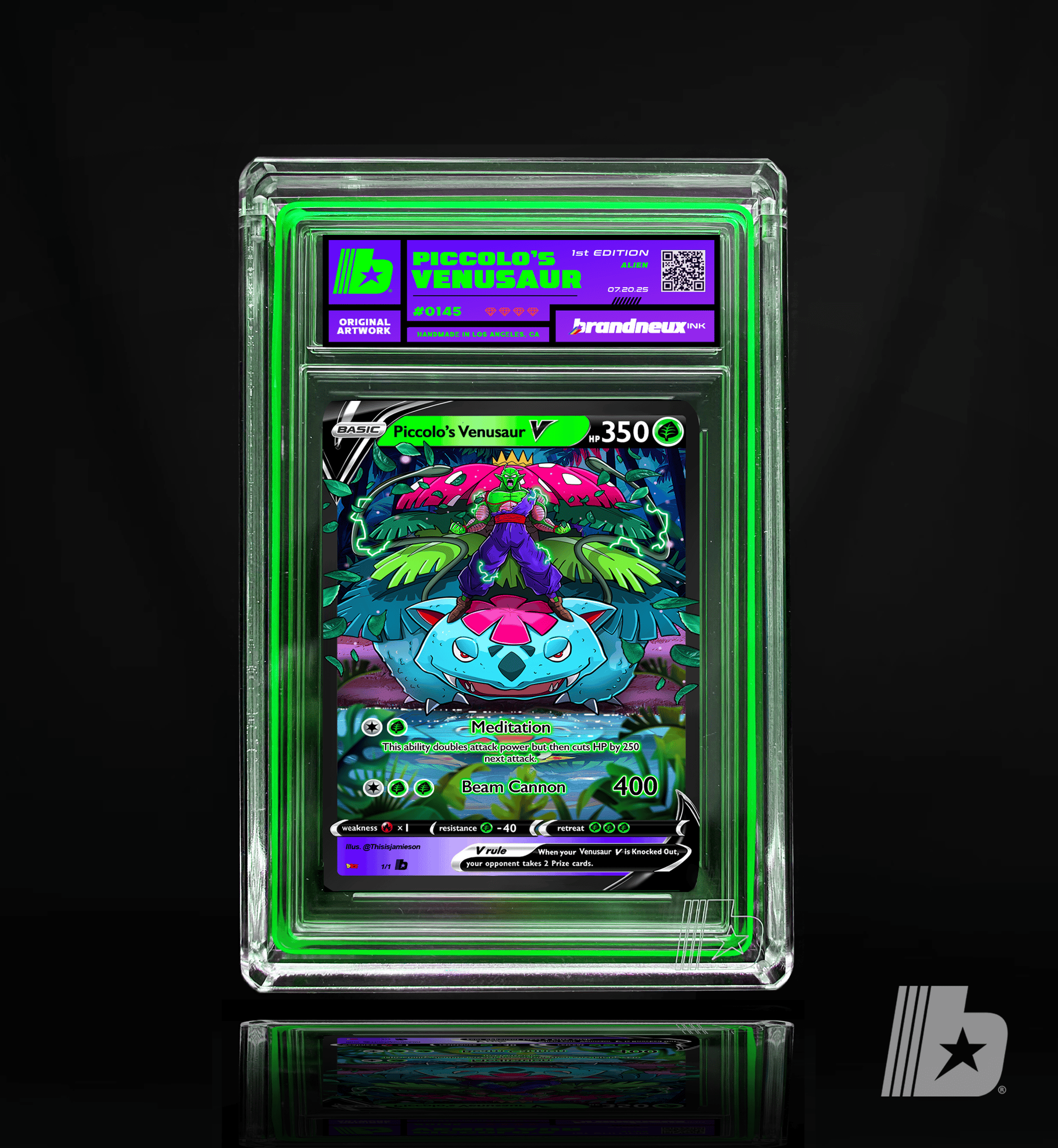 "Rooted in wisdom and wrapped in power, Piccolo and Venusaur stand calm in the storm—silent guardians of the battlefield. Cloaked in shades of emerald, they embody life, growth, and raw potential. Venusaur channels the strength of nature, slow to move but devastating when it does, mirroring Piccolo’s quiet focus and explosive force. Both carry the weight of mentors, warriors, and protectors, fighting not for glory, but for balance. Together, they are the stillness before the quake—deeply planted, endlessly patient, and unmistakably green."