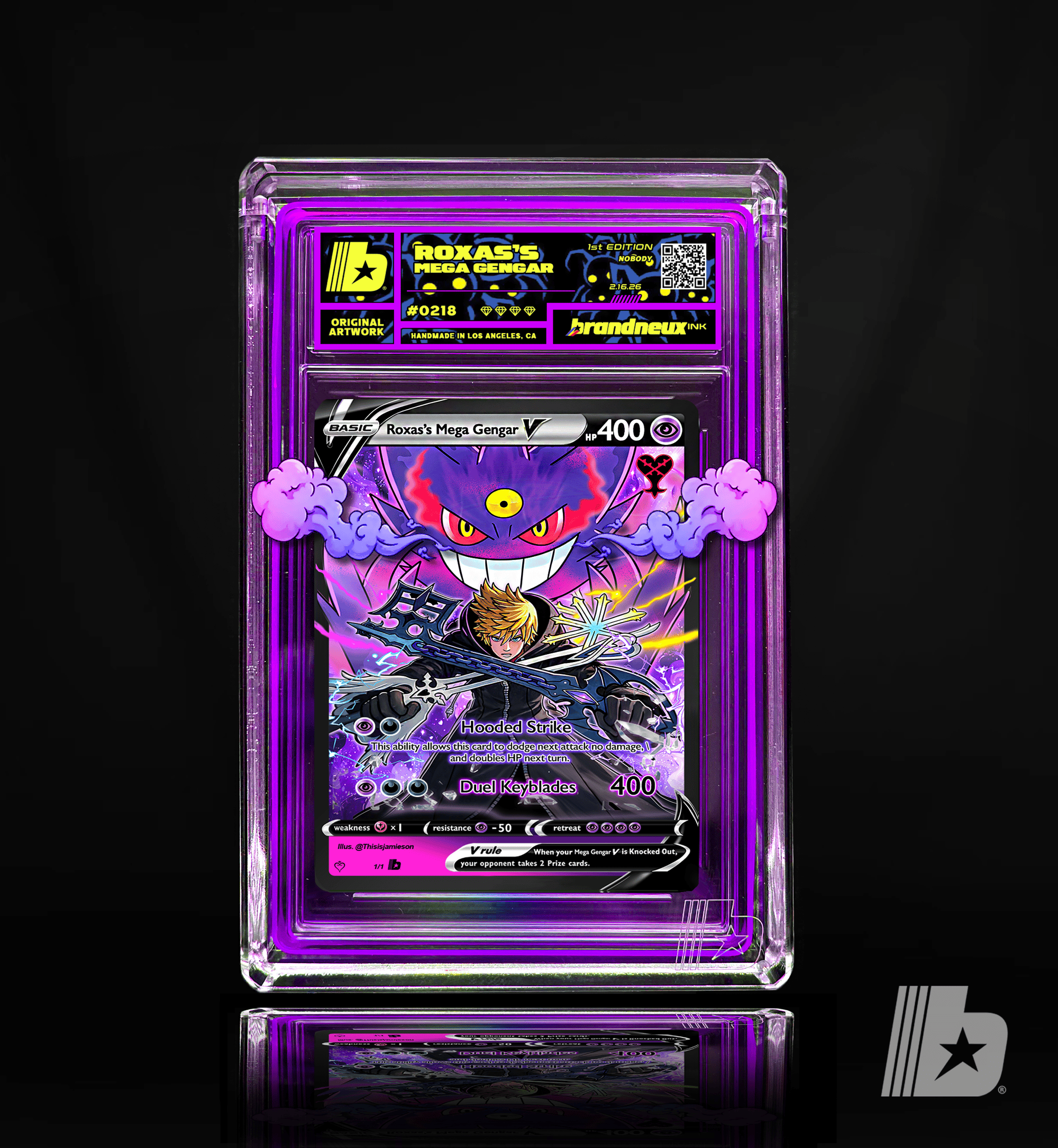 Together, they transform the battlefield into a realm of twilight where enemies lose their sense of reality, every shadow becoming a weapon under their control. Their bond reflects strength born from solitude—Roxas wielding darkness with purpose, and Mega Gengar ruling it with pure instinct—making them an unstoppable force within the world of shadows."