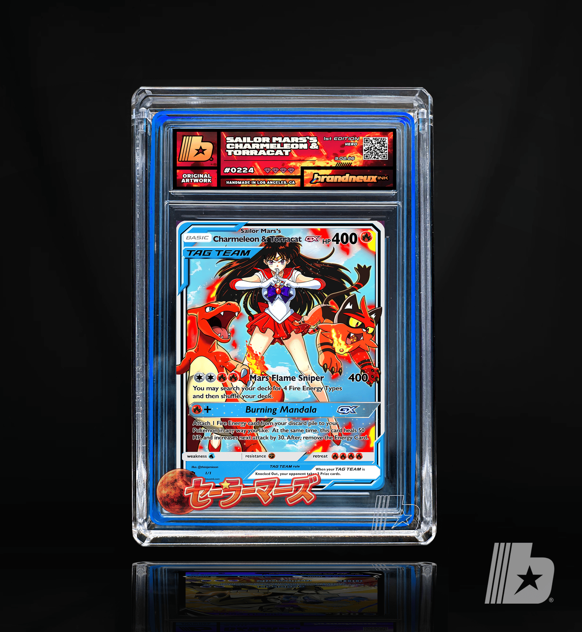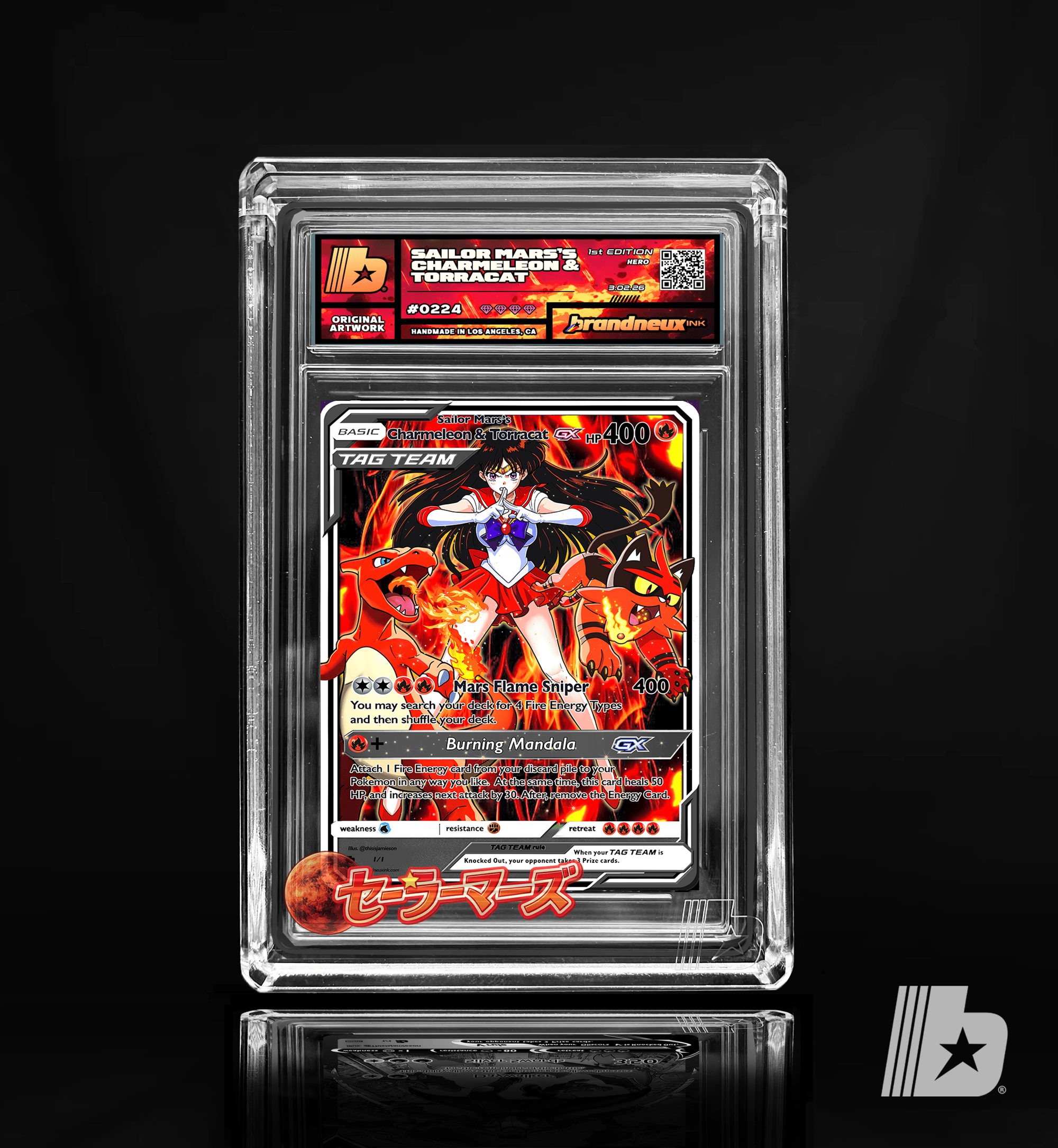 "Sailor Mars stands at the center of the battlefield, her spiritual flames burning with unwavering focus as her two fiery partners circle beside her. Charmeleon channels raw, explosive heat, its tail blazing brighter with every surge of power, while Torracat moves with precise, predatory grace, the bell of fire at its neck ringing like a warning before each strike. Together they form a perfect balance of discipline and instinct—Mars guiding the battle with sacred fire and intuition, Charmeleon unleashing relentless offensive force, and Torracat striking with swift, calculated ferocity. When their flames ignite as one, the air itself shimmers with heat, creating a blazing triad of willpower, loyalty, and unstoppable fire."