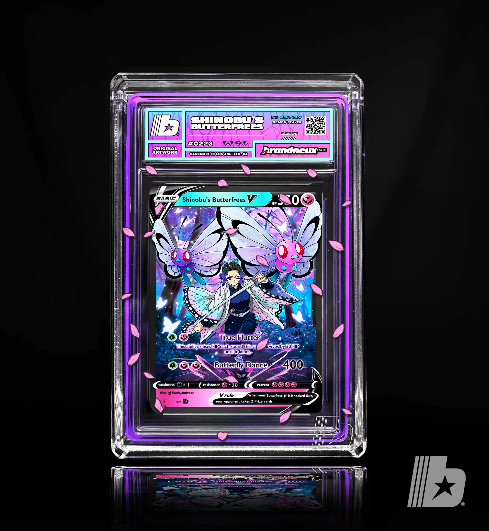 Shinobu’s Butterfrees represents a union of elegance and hidden lethality, pairing the Insect Hashira’s refined combat philosophy with Butterfree’s deceptively gentle power. Shinobu does not overpower opponents through brute strength; instead, she moves like a butterfly in flight—precise, graceful, and impossible to predict—delivering poison with surgical accuracy. Butterfree embodies this same duality, appearing delicate while releasing spores capable of ending battles before they truly begin. Together, they symbolize beauty masking danger, intelligence over aggression, and victory achieved through finesse rather than force. In the Brandneux universe, Shinobu’s Butterfrees drift silently across the battlefield, turning the air itself into a weapon, reminding collectors that the most dangerous forces are often the quietest ones.